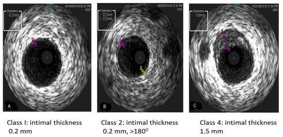 IVUS has been increasingly utilized over the years as it allows for earlier and more accurate detection of early and progressive changes in the coronary vasculature. IVUS has been extensively studied in adults and has emerged as an excellent tool for a more precise quantitative assessment of lumen size and intimal thickening []. In adults, the modified Stanford classification [], based on intimal thickening, has been used for diagnosis and the severity of CAV: Class 1 (minimal) intimal thickness < 0.3 mm and extent of plaque < 180 degrees; Class 2 (mild) intimal thickness < 0.3 and extent of plaque > 180 degrees; Class 3 (moderate) intimal thickness 0.3–1 mm and plaque extent < 180 degrees; and Class 4 (severe) intimal thickness ≥ 1 mm and extent of plaque > 180 degrees. In adults, an intimal thickness of >0.5 mm by IVUS is associated with nonfatal major cardiac events and/or graft loss []. Furthermore, more recent data showed prognostic relevance of intimal thickness > 0.35 mm by IVUS within 1 and 5 years of HT []. However, IVUS is technically more challenging and is associated with increased procedural risk, including coronary artery spasms and a reported risk of coronary artery dissections in as many as 1.6% of catheterizations []. In pediatric HT recipients, IVUS has been limited by patient size and size of available catheters, and IVUS has not shown any correlation with microvascular disease []. However, a single-center pediatric study by Kuhn et al. described their experience using IVUS in 30 children seven years or older. The authors concluded that IVUS was more sensitive than angiography in detecting early CAV []. Figure 7 describes IVUS findings of early and progressive increase in intimal thickness in pediatric patients after HT. The limitations of IVUS are: optimum imaging protocol is not defined, it is limited to epicardial coronary arteries with sufficient lumen, and no large-scale randomized trial in children is carried out to demonstrate IVUS guided strategy improves outcomes.