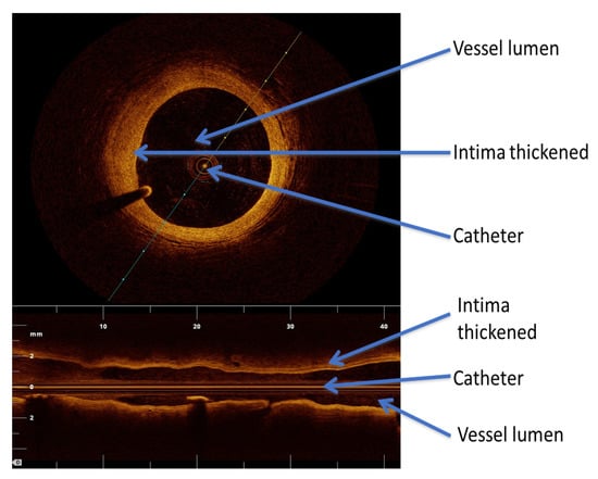 OCT is an intracoronary imaging technique. The technique is similar to IVUS but relies on the signal derived from the backscatter of light from a near-infrared frequency beam []. Figure 9 demonstrates a cross-sectional and longitudinal view of the coronary vessel and intimal thickness. The reflection time to the light probe is measured, and the characteristics of structures are inferred. The short wavelength of light results in images with a better resolution than IVUS (10 to 20 nm vs. 100 to 150 nm) []. The different properties of tissue, and the subsequent effect on backscatter, mean that it is possible to develop “virtual histology” of the vessel wall. OCT resolution is higher and has a good correlation and interobserver variability than IVUS. However, specialized personnel and availability in most centers are needed. OCT can provide important insights into coronary vascular changes not detected by angiography on pediatric transplant patients and correlates well with the intimal thickness measured by IVUS []. Pediatric data is limited; however, a study in 73 children after HT (258 vessel segments) showed a high prevalence of segmental and eccentric intimal thickening []. However, another study in late survivors after pediatric HT reported that OCT findings of vulnerable plaque and complicated coronary lesions are rare, in contrast with adult HT recipients []. Further prospective and more extensive studies are needed to study the clinical utility of OCT to demonstrate its prognostic implications in children.