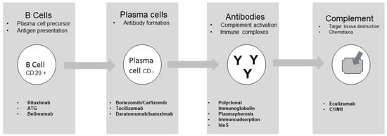 Three main drugs act on B cells leading to their reduction and reducing their activity of Rituximab (RTX), ATG, and Belimumab. In a study of Ramos et al. [30] conducted on 25 recipients of living donors needing desensitization, the effectiveness of RTX, IVIg, and ATG in reducing the number of splenic B cells and plasma cells was evaluated. The effect of multiple plasmapheresis plus low-dose IVIg reduced naïve B cells, plasma cells, and memory B cells. Adding RTX to the treatment was effective in a further reduction in naïve B cells, without an effect on memory B cells and plasma cells. Finally, adding ATG to the treatment led to a reduction in memory B cells (CD27+), but again without any effect on plasma cells.