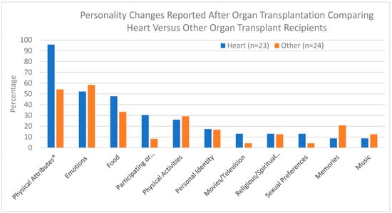 Figure 1 shows the types of personality changes reported after organ transplantation and compares such changes following heart versus other organ transplantation. The most pronounced changes reported were in physical attributes and these were more common following heart transplant than other organs. As previously noted, this finding may indicate cardiac effects, such as improved cardiac output and exercise tolerance.