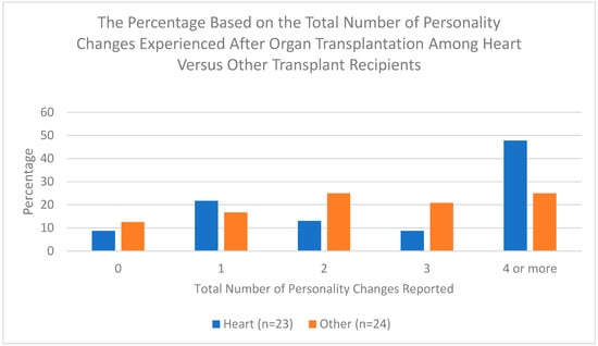 Table 3 summarizes the total number of personality changes presented in Table 2 that participants experienced after transplantation, excluding a change in physical attributes. Among all transplant recipients, 36.2% reported having four or more personality changes. When stratified by type of transplant, heart transplants were more likely to report having four or more personality changes compared to other organ transplants (47.8% vs. 25.0%), although this was not statistically significant.