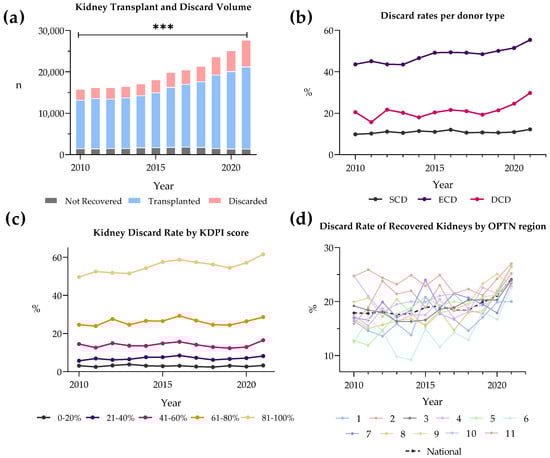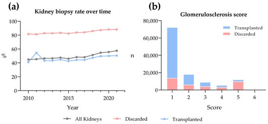 Kidney transplantation remains a cornerstone in the treatment of end-stage renal disease, offering patients freedom from dialysis and an improved quality of life. With nearly 89,000 waitlist candidates, the demand for kidneys far exceeds the available supply, creating a critical disparity in organ availability []. In 2021, pretransplant waitlist mortality rose to 6.0 deaths per 100 patient–years, the highest value since 2010 []. A significant contributor to this problem is the high rate of kidney discard, defined as donated organs that are procured but deemed unsuitable for transplantation.