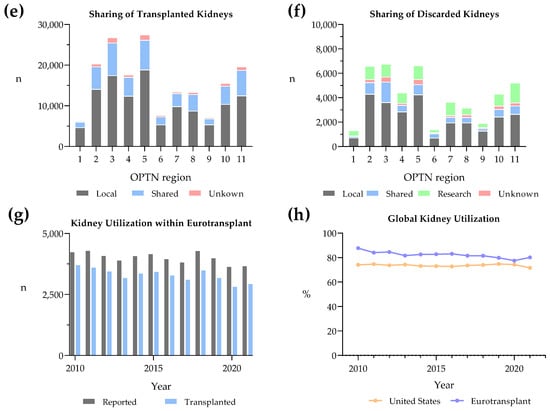To compare kidney utilization rates on an international level, we compared the deceased donor kidneys reported for transplant and transplanted within the Eurotransplant region. The total number of reported deceased donor kidneys within the Eurotransplant region was around 4000 over the past ten years compared to 20,000–30,000 in the United States (Figure 1a,g). The deceased donor kidney utilization rate within the Eurotransplant region was between 77 and 89% over the past ten years, whereas the American utilization rate ranged between 71 and 75% (Figure 1h).