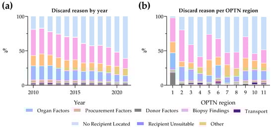 Considerable variations in discard rates were observed among the 11 OPTN regions, underscoring a complex landscape. While discard rates have risen across all regions, regions 2, 9, 10, and 11 have experienced a remarkable 10% increase since 2010 (Figure 1d). Not only do discard rates differ across OPTN regions but also the reasons for discard and the utilization of HMP (Figure 2b and Figure 3b). These differences may be due to several factors including differences in organizational practices and protocols, donor population characteristics, transplant center preferences, public awareness, economic factors, and geographic variations []. Additionally, these differences could be explained by the major discrepancies between the 11 regions when looking at population, donors, members, recipients, transplants, and land area []. Interestingly, regions 2, 9, 10, and 11 have a much lower percentage of land area yet meet or nearly meet the average percentages of population, donors, members, recipients, and transplants of the other regions. Establishing more balanced regions considering these factors might potentially enhance organ allocation.
