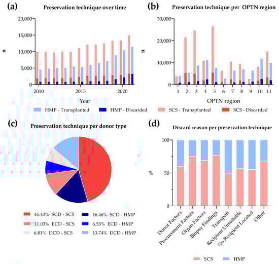 Additionally, we conducted a comparison of preservation techniques. Although static cold storage (SCS) remains the primary technique employed, the adoption of HMP has more than doubled since 2010 (Figure 3a). In 2021, there was nearly an equal number of discarded kidneys between HMP and SCS (Figure 3a). Noteworthy differences in donor demographics were observed based on the preservation technique (Table S2). When looking at the different OPTN regions, the utilization of HMP varied, showing a higher prevalence in regions 1, 9, 10, and 4, while regions 2, 3, and 5, characterized by the highest kidney volume, tended to favor SCS more frequently (Figure 3b). When categorized by donor type, SCS was used most frequently for SCD and ECD compared to HMP (45.43% and 11.03% vs. 16.46% and 6.53%; Figure 3c), while HMP was used more frequently among DCD donors. When looking at KDPI scores, there were fewer kidneys with a low (0–20%) KDPI score placed on HMP (27% on HMP vs. 73% SCS; Table S2). Of the reasons for discard, “transport” played a major role for kidneys preserved on HMP. In contrast, “biopsy findings” emerged as the primary contributing factor for discard among kidneys preserved on SCS (Figure 3d).