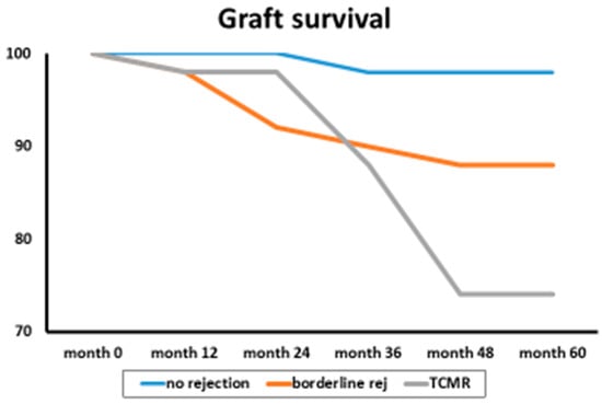 The group of patients was followed for 60 months, and borderline rejection was associated with renal dysfunction, acute tubular necrosis, and chronic tubular atrophy. Additionally, patients with borderline rejection were associated with reduced graft survival (Figure 1).