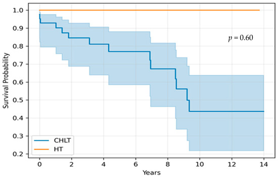 A survival analysis was conducted using Kaplan–Meier curves to visually inspect differences between HT and CHLT patients. Log-rank analysis was not performed because one of the groups had no events. Cox proportional hazards regression models were not conducted due to limitations imposed by the sample size.