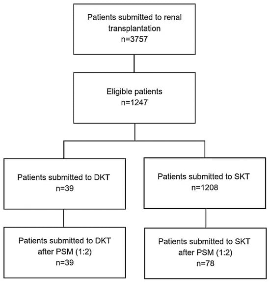 We calculated a sample size for non-inferiority with the SampSize online application, with an alpha of 0.05 and power of 90%. The calculated total sample size required for the analysis was 78 patients. The non-inferiority margin was set at 10% for five-year GS and OS, supported by previous meta-analyses showing a 78.4% survival rate for ECD kidneys against 86.4% from standard-criteria donors [,]. Patients who received DKT were matched to those who received SKT using propensity score matching (PSM) in a 1:2 ratio, which allowed the creation of two groups balanced in terms of potential cofounding baseline variables. The propensity score was estimated by multivariable logistic regression analysis based on donor covariates: age, sex, serum creatinine levels, and dead from CVA. Variables used on PSM were used to select ECDs suitable for transplant. Matching was performed by finding the two SKT propensity scores that were closest to the DKT propensity score, ensuring comparability between the groups for subsequent analyses.