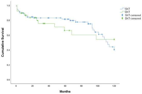 There was no statistically significant difference between 10-years GS between the two groups (p = 0.961) either. At 9-year follow-up, where the last data were censured, GS was 60.8% (95%CI: 53.6–68.0%) for SKT and 54.1% (95%CI: 43.3–64.4%) for DKT (Figure 2).