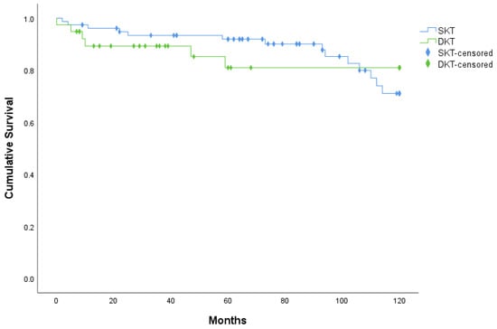 In terms of overall survival, there was no significant difference between the procedures. The 10-year OS was 71.1% (95%CI: 64.1–78.1%) for SKT and 81.0% (95%CI: 73.7–88.3%) for DKT (Figure 3).