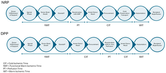 The two primary techniques utilized for DCD heart procurement are Normothermic Regional Perfusion (NRP) and Direct Procurement and Perfusion (DPP) [28]. A comparison of the NRP and DPP procurement timelines is depicted in Figure 1.