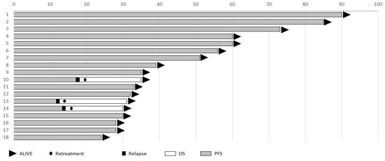 This study enrolled 42 patients between 2016 and 2021, with a median age of 32 years (range 19–75). At the start of PD-1 treatment, 25 out of 42 (59%) patients had stage III or IV disease. PD-1 inhibitors were initiated a median of 28 months (range 7–223) after the initial diagnosis of cHL, with a median of four previous lines of treatment (range 3–7). Prior to PD-1 therapy, 23 out of 42 patients (55%) had undergone autologous HSCT, and 4 (9%) had undergone allogeneic HSCT. All patients received brentuximab vedotin (BV) prior to PD-1 blockade, and PD-1 inhibitors were administered as a single-agent therapy.