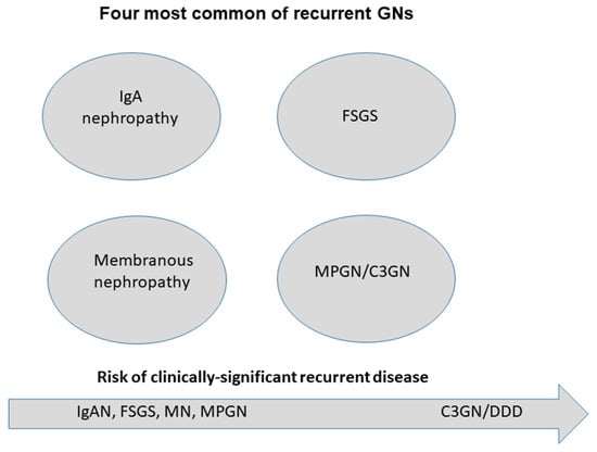 The risk of primary glomerulonephritis (GN) recurrence in the kidney allograft is based on the type of GN and is the second or third most common cause of death-censored graft loss [3,4], as shown in Figure 1. Recognizing and managing this risk before and after kidney transplantation is critical to long-term outcomes. All forms of primary GN may recur, but the risk of recurrence differs by subtype of GN.