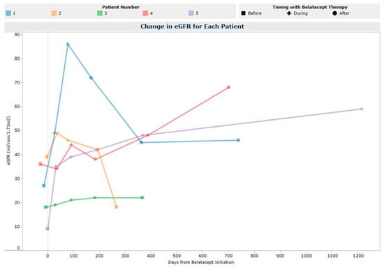 Additionally, it is unclear at what time after transplant or degree of renal insufficiency belatacept should be initiated to maximize renal improvements. De novo use of belatacept in lung transplant is associated with increased risk of mortality, which precludes its widespread use early post-transplant [26]. However, earlier initiation of belatacept may be prudent to avoid the onset of chronic CNI nephrotoxicity. In the Timofte case series, patients initiated on belatacept between POD 140 and 400 exhibited improvements in renal function, and patients initiated on belatacept between POD 347 and 2176 had stabilization of renal function, suggesting that earlier initiation may be of greater benefit. However, with the case series from Iasella, timing of belatacept initiation was not associated with degree of renal improvement, as patients initiated up to 9 years post-transplant still had renal improvements [15,16]. In our study, belatacept was initiated at a range of POD 61–3778, and there was no correlation between timing of initiation and renal function changes.