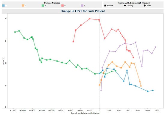 Forced expiratory volume in one second (FEV1 L) values are depicted in Figure 2. FEV1 declined from baseline to last follow-up (median change −0.53 L). Treated acute cellular rejection occurred in 3/5 (60%) LTR on belatacept; of these, 2 (patients 1, 2) were presumed acute cellular and treated with intravenous methylprednisolone, and 1 (patient 5) was symptomatic A1B0 rejection which was treated with an oral prednisone burst. No donor-specific antibodies (DSA) developed on belatacept. One LTR (patient 1) had DSA prior to initiation (DQA1*05 in association with DQ2 with MFI 1072), which cleared during belatacept therapy and remained negative at last follow-up 377 days after belatacept discontinuation. One LTR (patient 4) developed antibody-mediated rejection 142 days post-belatacept discontinuation that was treated with methylprednisolone, plasma exchange, carfilzomib, and IVIG. No LTR experienced development of CLAD (patient 1, 2, 4, 5), and no progression of pre-existing CLAD occurred during belatacept therapy (patient 3). Post-belatacept discontinuation, two LTR developed CLAD. Patient 1 developed CLAD stage 2 (165 days post-discontinuation) and patient 2 developed CLAD stage 2 (90 days post-discontinuation). Both patients 1 and 2 progressed to CLAD stage 3 and patient 3 remained in CLAD stage 3 throughout the last follow-up.