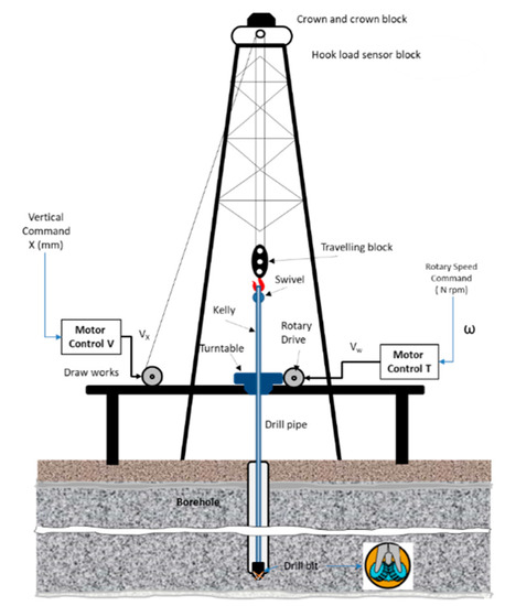 A basic rotary drilling method was taken into account for this analysis; see Figure 2. This type of drilling system was used because the most common drilling system is now used to reach the reservoirs of fossil fuel below the surface of the earth. By spinning a drill bit, the rotating drilling mechanism produces a drill hole. Normally, an electric motor mounted on the surface supplies the energy for rotation.