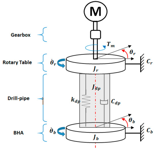 In many cases, the modelling of the drill string is considered to be a torsional model of a conventional vertical drill string with two degrees of freedom [15], as reported in [13]. The two-degrees-of-freedom torsional model is presented in Figure 3, where the first mass represents the rotary table inertia (), which is affected by the motor and gearbox at the side of the motor, and the second mass represents the BHA inertia . The two masses are connected by the torsional coefficients of stiffness ) and damping ). The drill pipe is dumped due to the drilling mud, the structural damping of drill pipe, and friction between the drill pipe and wellbore.