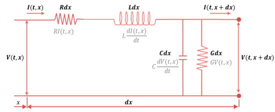 Based on Figure 5, the presented elements have a voltage input at point , and, due to the voltage, an input current at point is generated. Therefore, the element has output voltage and output current . The voltage and the current in the presented circuit can be described using two equations that are based on Kirchhoff’s current and voltage law. The derived equations are known as telegrapher’s equations.