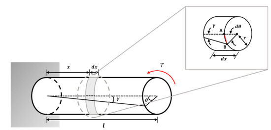 The twisting angle can be substituted into Equation (10) to give shear stress: . From this relationship, one can assume that , and are constant along the shaft length. By substituting the two relations into the torsion formula (Equation (9)), the equation can be derived as: . Solving the above equation in terms of torque leads to: