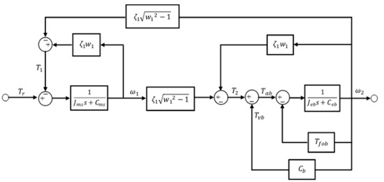 where Jms is the equivalent mass moment of the inertia of drive system, is the equivalent viscous damping of drive system, is the equivalent mass moment inertia of the BHA, is the equivalent viscous damping of the BHA, and is the friction torque on the bit due to the bit–rock interaction and is represented by the dry friction model. The applied torque on the bit () from the drill string in the D–L model is , where is the viscosity damping torque over the BHA. Figure 8 shows the derived D–L model of the presented drilling system.