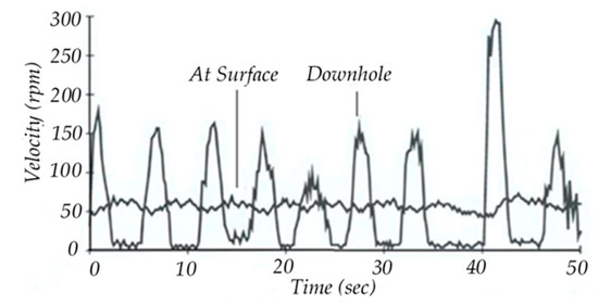 The non-linear relationship between the torque and angular velocity on the bit is responsible for stick-slip motion. Even when the engine steadily turns the bit [11,12], the drilling and BHA over the engine push around the stick/slip. Torsional vibrations induce drill brace fatigue, slow the process of boiling, and damage bits, drilling pipes, and the BHA.