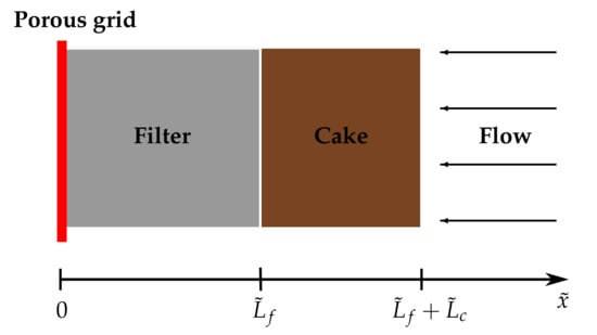 Employing the framework from Köry et al. [], we introduce a spatial variable , impose an input pressure at and impose an output pressure at such that (see Figure 1). This results in a one-dimensional flow oriented in the negative direction. We denote to be the (positive) fluid flux through the filtercake per unit area and allow to vary with time but hold constant. We assume that all the particles are bigger than the pores in the filter.