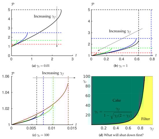 Temporal evolution of the transmembrane pressure difference to maintain a constant flux for varying values of (black), (blue), (green) and (red), and for (a) (b) 1 and (c) 100. The horizontal dashed lines show the critical pressure at which the filter would shut down, Equation (31). The vertical dashed lines show the critical time at which the cake would shut down, Equation (41). We plot the pressure–time curve until one of these lines is reached. If the horizontal bound is reached first then the filter shuts down; if the vertical bound is reached first then the cake shuts down. (d) shows whether the shutdown occurs in the filter or in the cake depending on and . Note that varies over a much larger range than to capture the appropriate parameter space within which the transition occurs, which also reflects the fact that we expect the cake to be more compressible than the filter material in practice.
