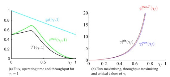(a) Flux, , given by (35) (cyan); maximum operating time, , given by (44) (green); and the maximum throughput, given by (45) (black). Here, . (b) The value of that: maximises the operating time, , given by (46) (blue); maximises the throughput, , given by (47) (red); and the critical value that separates cake or filter shutdown, , given by (42) (black).