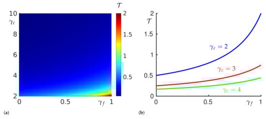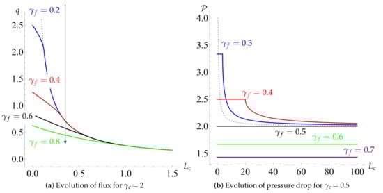 and note that these dimensionless parameters are natural extensions for the two porous media (filter and cake) of the dimensionless sensitivity parameter from Köry et al. []. These parameters characterise the sensitivity of the permeability of each porous medium to its deformation. While the precise values of will depend on the particular filter material and the contaminants that are being filtered, we may make some general observations on the values that may be taken. First, we note that both and must be positive. Second, we require in order that the filter does not shut down before any cake has been deposited (see Equation (20)). Third, we would usually expect the cake to be more deformable than the filter material. This means that we would expect the effective elastic constants, and , to be smaller for the cake than the filter, and so we would expect that . Recalling that, at , we have and , (27) provides an expression for the flux at given by