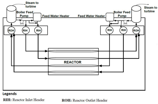- Reactor Headers: Several Reactor Inlet Headers (RIH) form a part of the reactor’s Primary Heat Transport (PHT) System. The PHT is a closed circulating system that maintains the flow from Inlet Headers through the reactor to the Outlet Header (ROH). The basic arrangement of reactor headers is shown in Figure 1.