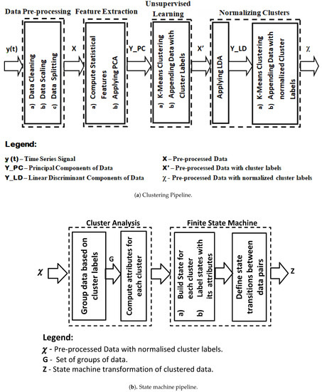 This section discusses the methodology adopted to implement visual analytics approach. Figure 3 shows the methodology pipeline which helps plant operators to understand, visualise, explore, and model the Nuclear Power Plant (NPP) data. The pipeline is divided into two parts based on the operation to be performed on the data. Figure 3a represents the pipeline architecture responsible for carrying out clustering of the data. Clustered representation of data helps in better visualisation and outlier analysis. In order to explore patterns and model the NPP data, clustered representation is generalised as finite state machines. Transformation of the same is illustrated in Figure 3b. The steps and operations associated with both the pipelines are discussed below.