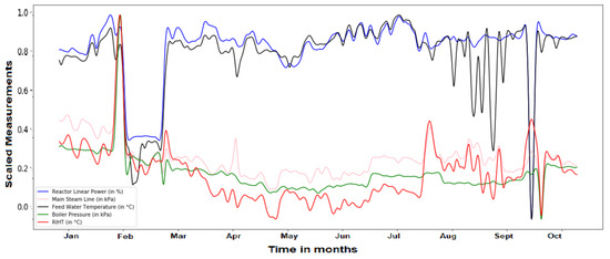 The data extracted from the sensors installed at the NPP is prone to noise, outliers, missing data during shutdown periods. Therefore, data cleaning is performed before any other processing. Missing data is imputed with suitable values; for instance, during shutdown of NPP, the power measurements of the plant are set to zero. The measurements from the sensors are captured on different scales, for instance, Reactor Inlet Coolant Temperature is measured in °C and Reactor Power is measured in %. Therefore, Min-Max scaling is performed to bring all parameters on the same scale (into the range [0–1]) for easy analysis and understanding.