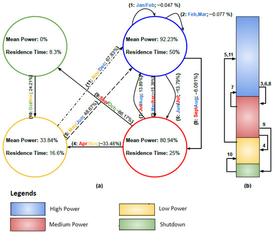 Figure 7 shows the finite state machine representation of Power data in year 2007. Four system states high power, medium power, low power, and shutdown are defined corresponding to the cluster groups. Mean power capacity and residence time for each cluster are computed and assigned to the respective system states. State transitions are drawn according to the cluster transitions that happened in 2007. Table 2 computes the state transition rules for the state machine diagram. The table shows 11 month pairs, which are labelled as 1,2,3,4,5,6,7,8,9,10,11 in Figure 7. The mean of the powers of each month is subtracted from the mean of the powers of the previous month to calculate the amount of power transition () between 2 consecutive months. For example, for the pair January-February, = mean power (February) – mean power (January) = −0.047 that implies that power in Feb is less than power in Jan but by a very small amount. Therefore, the transition occurs from state 1-1 and both Jan and Feb lie in the system state 1 (High). Similarly for the next pair, Feb–Mar, the is again very small. So, the transition again occurs between 1-1 and Mar also lies in state 1 (High). Next, for Mar–Apr, the value of = −33.489, which implies that mean power of Mar is greater than mean power of Apr by a significant amount. Therefore, state transition from 1–2 (High to Medium) takes place and Apr comes under state 2 which is Medium. In a similar way, transitions for all the month pairs are calculated subsequently. Figure 7a represents the complete finite state machine with all system states and state transitions, whereas, for better visualisation and to model high level behaviour of NPP a simplified version of state machine is represented in Figure 7b. The strip representation of state machine focuses only on the transitions that occur from one state to another and ignores self transitions. Therefore, labels 1 and 2 that include the months Jan-Feb and Feb-Mar are not shown. On observing the mean power capacity levels of system states in Figure 7, it can be stated that NPP operates in four distinct states namely, high power, medium power, low power, and shutdown (zero power) over the year. State transitions illustrate how each of these states communicate with each other and therefore model the working flow of the NPP.