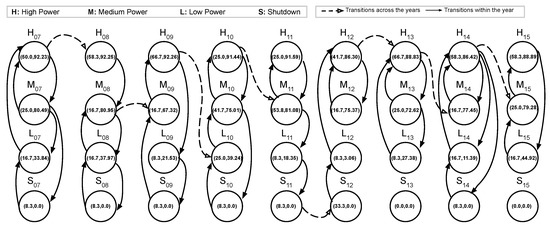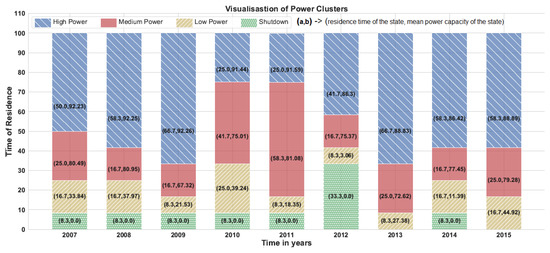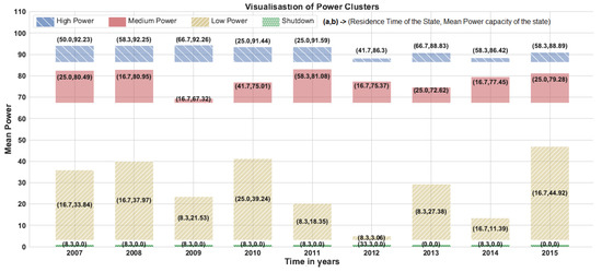 Similarly, strip representations of state machines are defined for the other years and behaviour of NPP is modelled over the years. Figure 8 and Figure 9 represent the strip visualisations from 2007 to 2015 based on time of residence and mean power, respectively. Each state of the strip is labelled with an order pair (a,b) where a: residence time of the state and b: mean power capacity of the state. It is observed that in all years, the representation and definition of four states remain consistent, thus validating the clustering algorithm. High power state always tend to have high mean power capacity and shutdown periods consistently show zero mean power across all the years. Similar patterns are observed for medium power and low power states as well in Figure 8 and Figure 9. Therefore, the strip representation allows better visualisation over longer periods as well as extracts meaningful patterns out of the data. On closer analysis of this representation, it is found that there is a shutdown for one month (8.3% of year) every year from 2007 to 2011. However, in 2012, NPP is shut down for three months (33% of year); in addition, there is no shutdown period for years 2013 and 2015. Hence, the anomalous behaviour of NPP over the years is also captured by the strip representation of state machines. Figure 10 shows the finite machine representation that models the behaviour of NPP across all the years. State transitions are defined for both within year as well as across year transitions. Each state in Figure 10 is represented as combination of character (power level) and digits (year). In the normal operation, plant tends to operate at high power levels for the largest proportion of time and is in shutdown phase for the least duration of time. In addition, transition of power level takes from high to medium, medium to low, and finally from low to shut down. Then, gradually power levels are restored in a reverse order. However, in some years (2009–2010), plant deviates from its normal operational pattern and makes transitions directly from high power levels to low power levels. When the same happens, plant operates in high power levels for comparatively shorter period and tends to operate in suboptimal power range for the most of time in the remaining year. Therefore, with finite state machine representation of data, it is possible to capture the anomalous behaviour of NPP.
