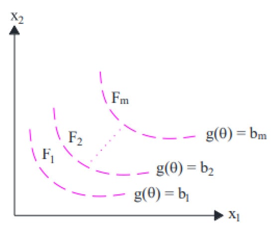 Subset simulation (SS) is one of the most efficient methods for calculating the probability of failure for engineering problems that have a small probability of failure []. In this method, the probability of failure is expressed by multiplying large amounts of conditional probabilities. Thus, the failure probability of the problem becomes a sequence of conditional events. In the simulation process, conditional samples are generated using the Markov chain and the Metropolis algorithm to cover the failure area []. According to Figure 1, if and the intermediate events are defined as [,]: