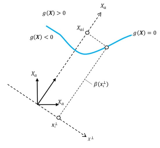 where is a realization of the random variable , which is defined along ; is a realization of a vector of random variables orthogonal to , denoted as ; and is a function representing the failure domain along , defined on . Then, Pf can be expressed as follows: