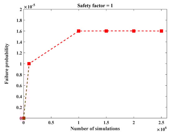 In assessing the reliability analysis of a complex problem, the first step after defining the limit state function and determining the distribution functions of the input random variables is to select the appropriate setting parameters or the number of samples required for the simulation process for each reliability method. The selected values of simulation in each method (i.e., MCS, SS, IS, LS, and DS) in this study are presented in Table 2. Besides, the diagram of convergence for the MCS is shown in Figure 3. According to the reported values in Table 2 and Figure 3, the MCS needs more than one million simulations to achieve accurate results of the failure probability of the presented problem of a bridge pier under local scour conditions. In contrast, a suggested number of 1000, 6000, 100, and 150 simulations were attributed to the IS, SS, LS, and DS, respectively, in order to reduce the computational cost burden compared to the one provided by the MCS. It is worth mentioning that these selected values in Table 2 are obtained by the same process as that illustrated in Figure 3 for all reliability methods, where the number of simulations is increased until the probability of failure value stabilizes. Thus, this procedure indicates the highly delicate nature and sensitivity of the reliability analysis process to the selection of a simulation number for accurate failure probability results.