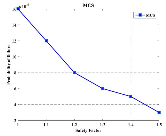 After the optimum selection of a suitable number of simulation samples for each reliability method, the reliability analysis of a local scour at a bridge pier formulated using the LSF in Equation (6) was performed using MCS, where the safety factor takes values in the range between 1 and 1.5 with a separated distance of 0.1. The obtained reliability analysis results are presented in Figure 4. It is obvious that the results clearly show a decrease in Pf values with an increase in safety factor values. Moreover, it can be indicated that the value of the reliability index (ꞵ) increased from 4.15 with a safety factor value equal to 1 to 4.52 with a safety factor equal to 1.5.
