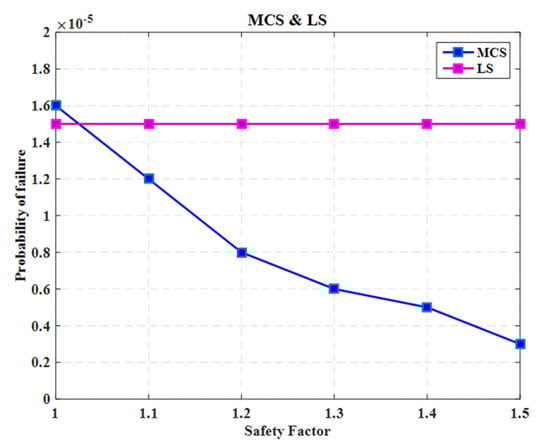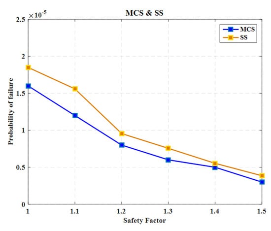 In the second step, based on the results obtained by using the MCS, the other reliability methods (i.e., SS, IS, DS, and LS) were evaluated for different safety factor values, and their performance results compared to the ones by the MCS are reported in Table 3 and shown in Figure 5, Figure 6, Figure 7 and Figure 8. According to the estimated results by the proposed simulation methods, it is clear that both the DS (Figure 5) and the LS (Figure 6) failed to estimate the probability of failure values of the studied problem due to the complexity and nonlinearity of the LSF (Equation (6)). Note that in these two methods, it is very important to find the optimum values of the direction vector a, and generally, as the complexity of the problem increases, it becomes very difficult to obtain an optimum value of the direction vector a for these methods, which is considered one of their major weaknesses. Moreover, the IS (Figure 7) has proven in some cases to be unable to make a good estimation of the probability of failure, as in the case of a safety factor value equal to 1.1, in which the obtained probability of failure by the IS is equal to 1.84 10−5, while using the MCS it is 1.20 10−5. However, the IS shows poor estimations compared to almost all the other cases compared to the MCS. Among the proposed simulation methods for the reliability analysis of a bridge pier under local scour conditions, the SS (Figure 8) is the only one that has been able to produce a good approximation of the failure probability for almost all the safety factor values. As an example of the reported results in Table 3 and Figure 8, the Pf using the SS for SF = 1.4 is Pf = 2.90 10−6, while using the MCS, Pf = 5.00 10−6, which is relatively very close.