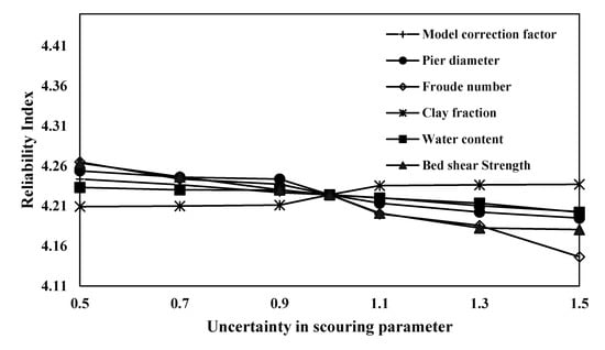 After the evaluation of the proposed simulation methods for solving the problem of the local scour of a bridge pier, the influence of the different parameters included in the LSF (Equation (6)) formulation on the reliability index was carried out. The influence of the scouring parameters on the reliability index was investigated for variations in a range from 0.5 to 1.5 (i.e., 50–150%). These parameters include the model’s correction factor (), pier diameter (D), Froude number (), clay fraction (C), water content (Wc), and bed shear strength (). The results of the sensitivity analysis against uncertainties are plotted in Figure 9. From the results, it should be clear that the reliability index value decreases with an increase in the uncertainties from 0.5 to 1.5 for the Froude number, bed shear strength, and water content. Based on the reported analysis results, it can be seen that the Froude number has the greatest impact on the reliability index compared to the other input variables. In this way, with increasing uncertainty of from 0.5 to 1.5, the reliability index decreased from 4.26 to 4.14. In other words, the scour depth increases with an increase in the Froude number. Thereafter, the bed shear strength, clay fraction, and water content affect the bridge pier, causing failure. The bed shear strength and the pier diameter have a similar behavior to the Froude number with regard to their uncertainty in scouring. In contrast, with uncertainty increasing in the clay fraction, the reliability index slightly increases, so at first, with an uncertainty of 0.5, the reliability is 4.2, and in the end, with an uncertainty of 1.5, it is equal to 4.3.