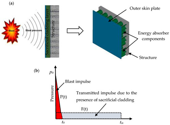Recently, sacrificial cladding structures have attracted more attention as effective blast alleviation techniques due to their superior energy absorption capabilities and low cost [3,4,5]. The sacrificial cladding structure has two layers (an outer plate and an inner core layer) as illustrated in Figure 1a. The face plate’s function is to evenly distribute the blast pressure across the crushable core layer which gradually deforms and absorbs large amount of impact energy, thus the pressure transferred to the structure is attenuated. The working concept of sacrificial cladding structure is when an explosive detonates in the proximity of infrastructures, it undergoes an instantaneous impulsive load for a very short time interval. To safeguard structures from these devasting impulses, the proposed cladding structures must be installed at the façade of those structures as shown in Figure 1a. During the explosion, the sacrificial cladding layers will be exposed to a high load (P0) pulse of short duration. The objective of the entire sacrificial cladding structure is to convert a high impulsive load with short duration to lower load with long duration as illustrated in Figure 1b. In order to evade permanent damage to the unprotected structure (main structure) from taking place, the failure load of the sacrificial cladding structure (Fmax) must be maintained less than the minimum elastic capacity of the main structure. Thus, the applied load conveyed to the main structure is minimized [6,7]. The efficiency of the sacrificial cladding structures mainly depends on the amount of energy absorbed by its core [8]. TW structures with various materials and shapes have been employed as effective energy absorber components in crashworthiness applications. It can attenuate a large portion of impact energy by converting it into plastic energy when it is deformed by the applied pressure produced by the shock wave [9]. Hence, they can be exploited as an effective core layer for sacrificial cladding structures.