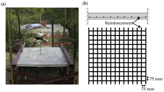 (a) Setup of the experimental blast test [14], (b) Slab cross-section and reinforcement.