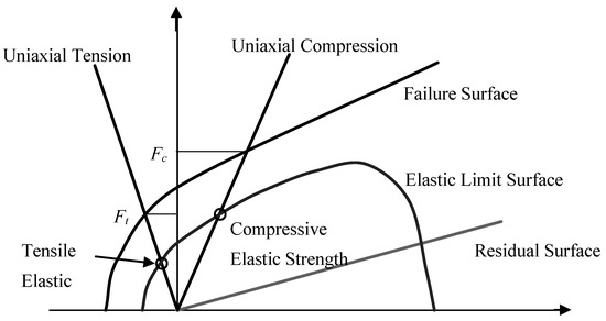 These nominated parameters (B and M) control the residual stress and affect the post-failure surfaces, while D1, D2 and , as illustrated in Equations (5)–(7) control the concrete post-softening behavior.