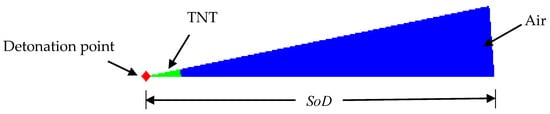 The computational cost of the 3D model for explosion simulations is quite expensive (consuming time and needs high computer storage). To overcome this problem with maintaining precise results, two techniques were adopted in this study. The first was taking the advantage of symmetry so a quarter of the model has been generated. The second was using remapping technique, which is an adequate approach to overcome the full 3D structure’s meshing problem. This technique allows a 2D model with fine mesh to be mapped into a 3D model with a coarser mesh. The remapping is usually done through a 2D axisymmetric model with a 1 mm element size that was created to simulate the detonation of the explosive charge, as shown in Figure 4. The 2D model was run until the shock vector just before reaching the concrete panel. Next, a remap file has been created and then imported to fill the 3D Eulerian domain (air block) as an initial condition, as shown in Figure 5.