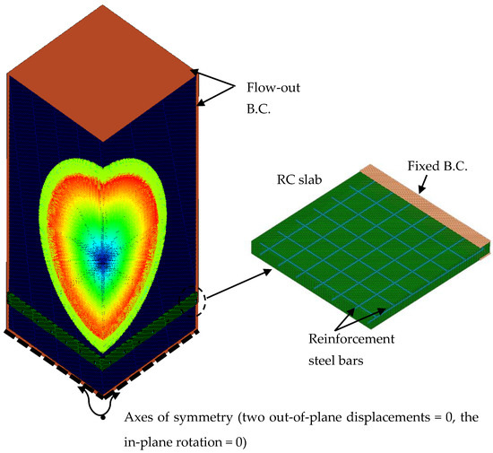 The Lagrange solver was employed to simulate solid continua (concrete panel) as the mesh move with the material distortion, Euler solver was adopted to model the gas flow resulted from an explosion as Euler supposes that the material can flow through fixed grid, while beam element was utilized to simulate the reinforcement steel bars. The FE model consists of air domain in which the explosion was initiated. The boundary condition of the Euler sub-grid (air domain) was set as a flow-out boundary at the four faces of the air block as illustrated in Figure 5. In the area supporting the slab, a fixed boundary condition was applied by restraining all the translational degrees of freedom for the nodes located on that edge. A reinforcement bond is considered between the steel bars and the concrete. The element size was selected to be 5 mm to attain consistent results. This size was selected, relying on an executed mesh sensitivity study. The erosion technique was implemented to model the severe damage that occurred to the panels such as spalling that might occurs at the bottom surface of the slabs. An instantaneous geometric strain of 0.6 was adopted in this study.