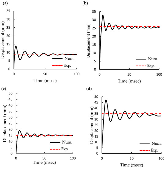 Numerical displacement time history and experimental deformations for; (a) Panel A, (b) Panel B, (c) Panel C, (d) Panel D.
