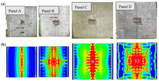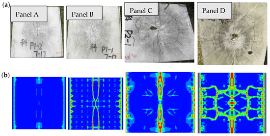 The upper surface damage of the RC slabs; (a) Experimental examination [14], (b) FE simulations.