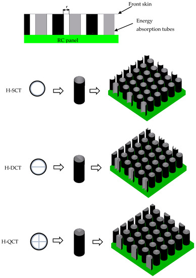 This section presents a sacrificial cladding structure consisting of a set of thin-walled hybrid structures that should be account for mitigating the significant portion of energy resulted from blast loading. Numerical models had been conducted for three configurations of the hybrid tubes; hybrid single cell tube (H-SCT), hybrid double cell tube (H-DCT), and hybrid quadrable cell tube (H-DCT) as illustrated in Figure 9. It is crucial to determine the behavior and characteristics (energy absorption, deformation pattern, peak crush load, etc.) of the standalone crushable core layer before designing a full-scale cladding structure. The authors themselves have investigated the energy absorption capabilities for metallic and hybrid multi-cell tubes [21]. They all showed a progressive crushing performance and desirable energy absorption capacity compared to solo metallic tubes. The sacrificial layer is designed with r (tube radius) distance in-between tubes, as shown in Figure 9. To allow the incidence of the progressive failure of the core layers. The core layer was covered with a front skin sheet made of aluminum with a 2 mm thickness. In contrast, the core layers presented in this study were fabricated from hybrid tubes wrapped with four uni-directional CFRP sheets. The CFRP layers had (0°/90°/0°/90°) layout around the AA6061-T6 tubes with three different configurations as illustrated in Figure 9. The tubes’ dimensions were 1.2 mm wall thickness, 60 mm inner diameter, and 120 mm in total length. The inner ribs were done to suit the tubes’ inward diameter to obtain the desired multi-cell tubes’ configuration. The RC panel’s blast performance was numerically investigated utilizing ANSYS/Autodyn under the effect of the blast loads. Panel D expressed the highest level of damage, so it was selected to highlight the effectiveness of the new proposed sacrificial cladding structures for protecting RC panels from blast hazard. Four-noded Belytschko–Tsay shell elements were used to model the front skin plate and the metallic tubes; however, a composite shell was adopted to represent the wrapped composite sheets. The RC panel was modeled as specified before. In the model, stress-criteria breakable bonded face connection was assumed between the structural elements (front skin, metallic tubes, CFRP tubes, and RC panel). The failure parameters listed in Table 3 were assumed for different breakable contact types. The constitutive models for the adopted materials are listed in Table 3. The whole structure was located in the created air domain and exposed to the blast loading produced by detonating 0.46 kg of TNT located at 0.4 m from the upper surface of the concrete and 0.386 m from the front skin plate.