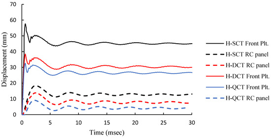 Mid-span displacement time history for Panels with different cladding structures (H-SCT, H-DCT, and H-QCT cladding structures).