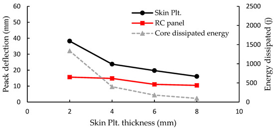Peak deflections and energy dissipated with skin plate thickness variation for RC Panel with H-SCT cladding structure.